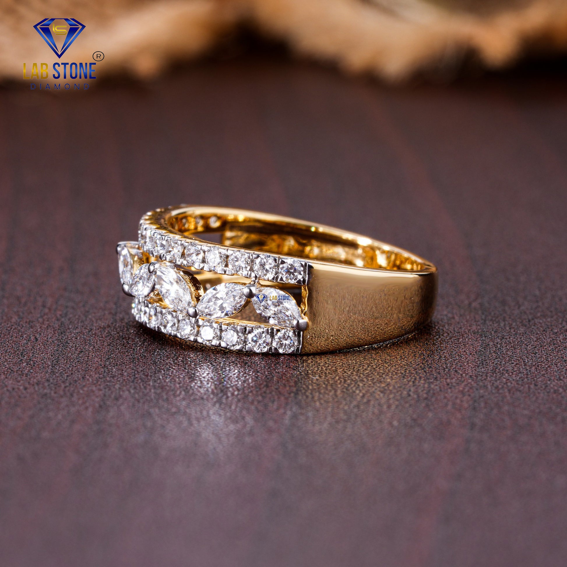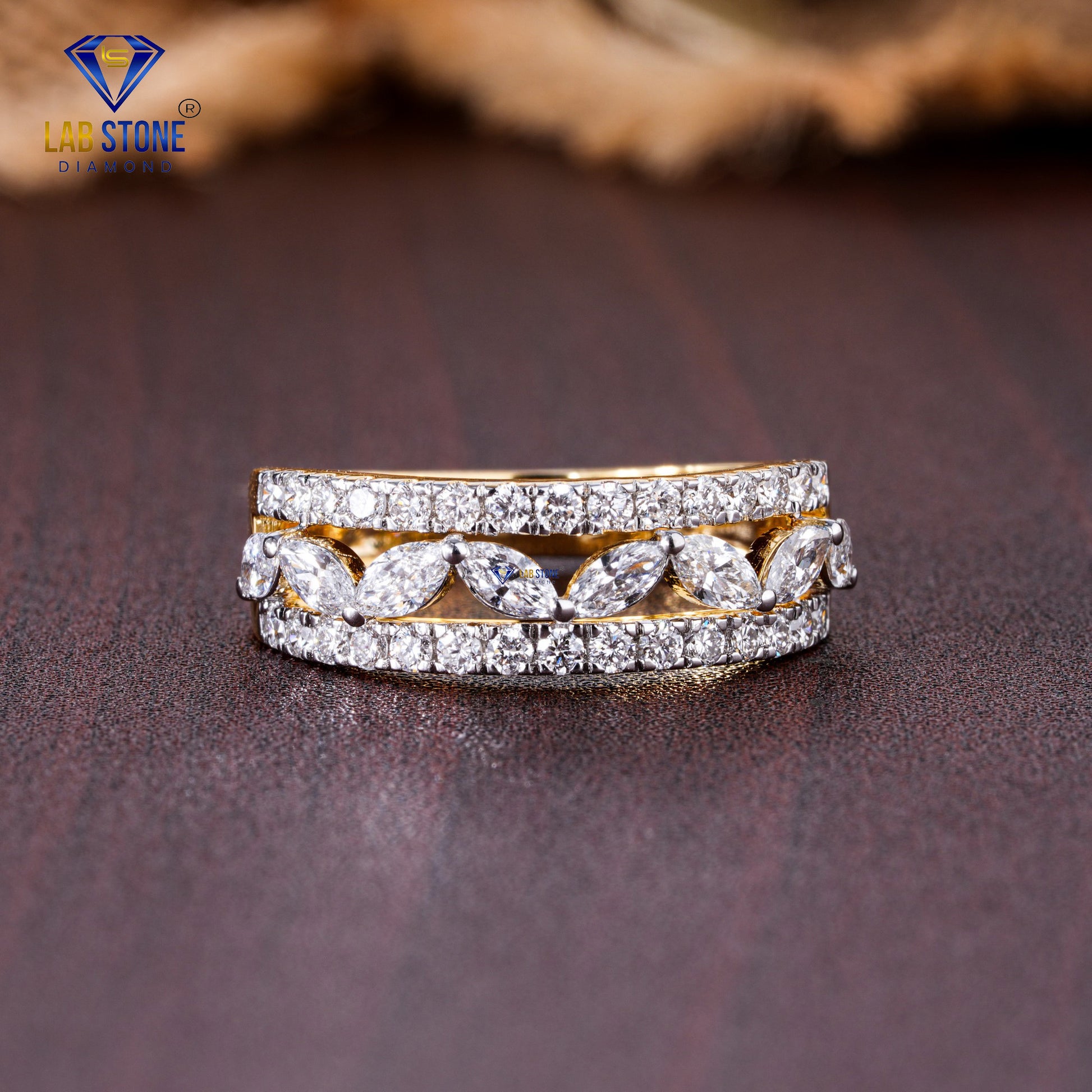 This elegant women’s band showcases a beautiful mix of marquise and round cut diamonds totaling 1.28 carats. The unique blend of shapes creates a captivating sparkle, while the sleek design makes it perfect for stacking or wearing alone. A timeless piece that adds sophistication to both everyday wear and special occasions.