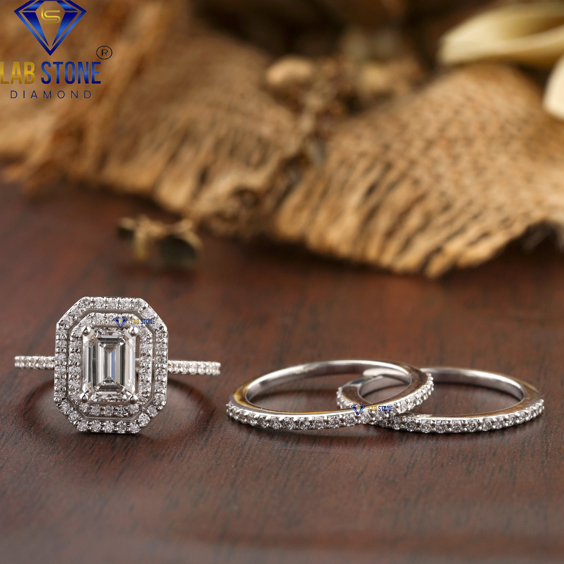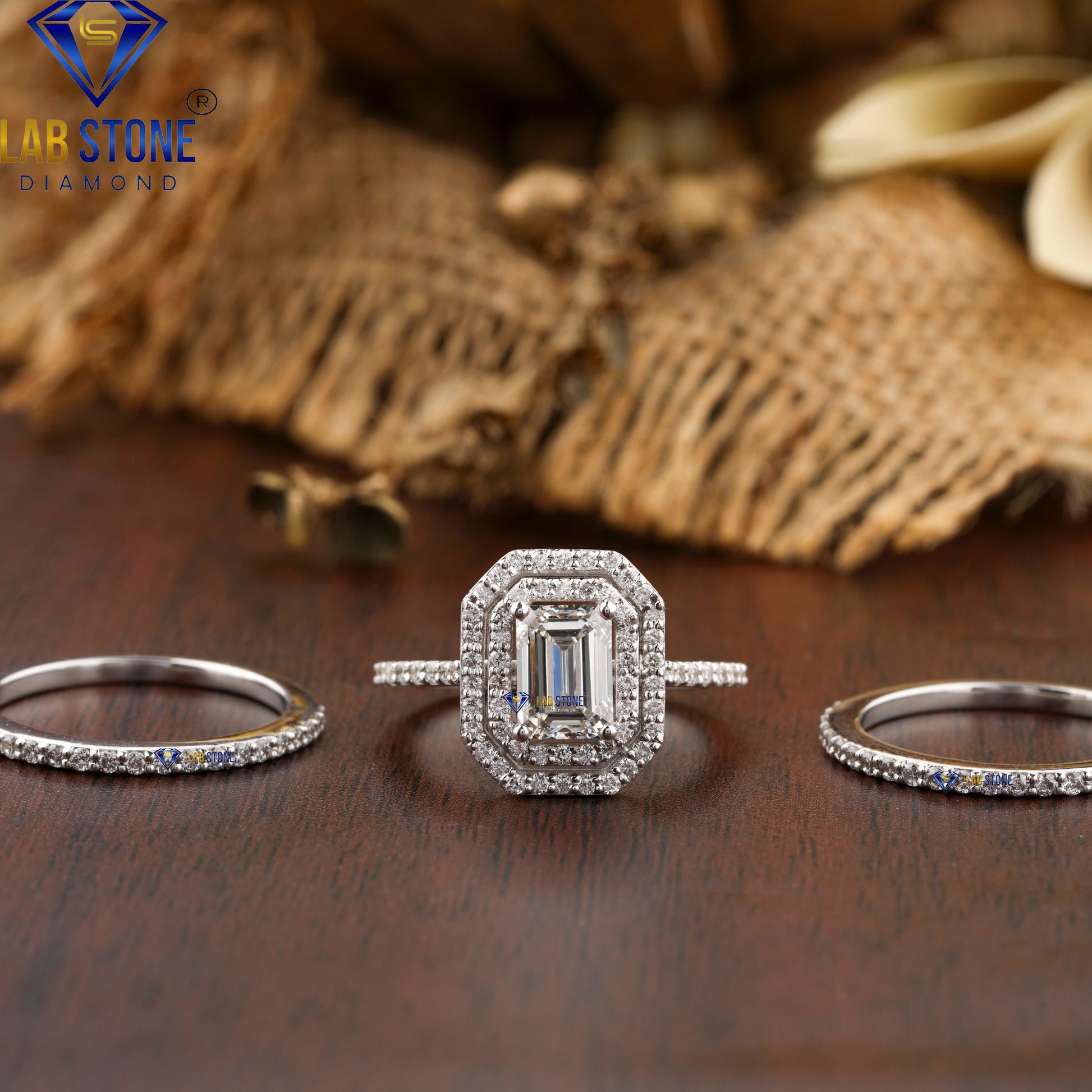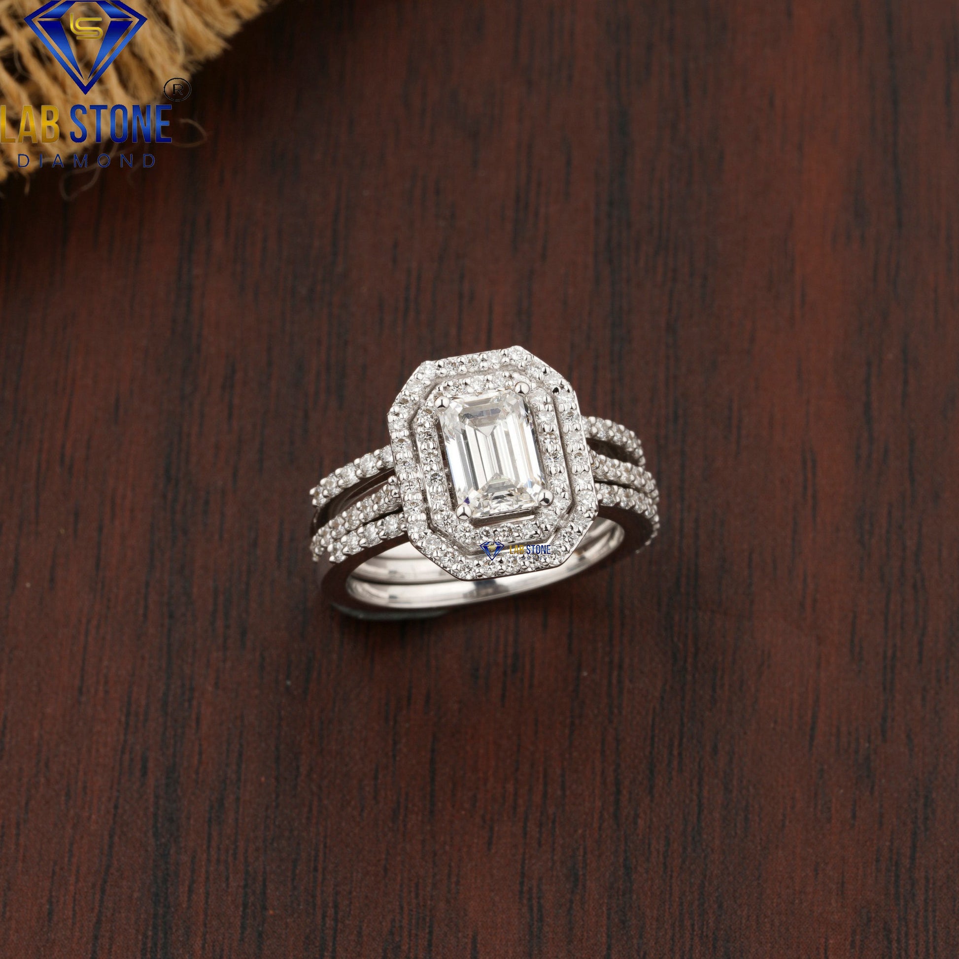 This 1.474 TDW ring set features a stunning emerald cut center diamond surrounded by round cut halo diamonds, paired with a matching band for extra brilliance. Elegant and timeless, it is the perfect choice for weddings, anniversaries, or special occasions.