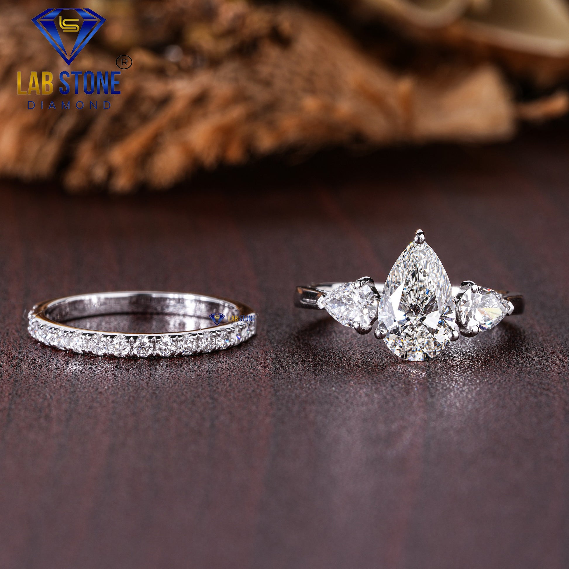 1.79 TDW Pear & Round Cut Women’s Three Stone Diamond Ring with Band