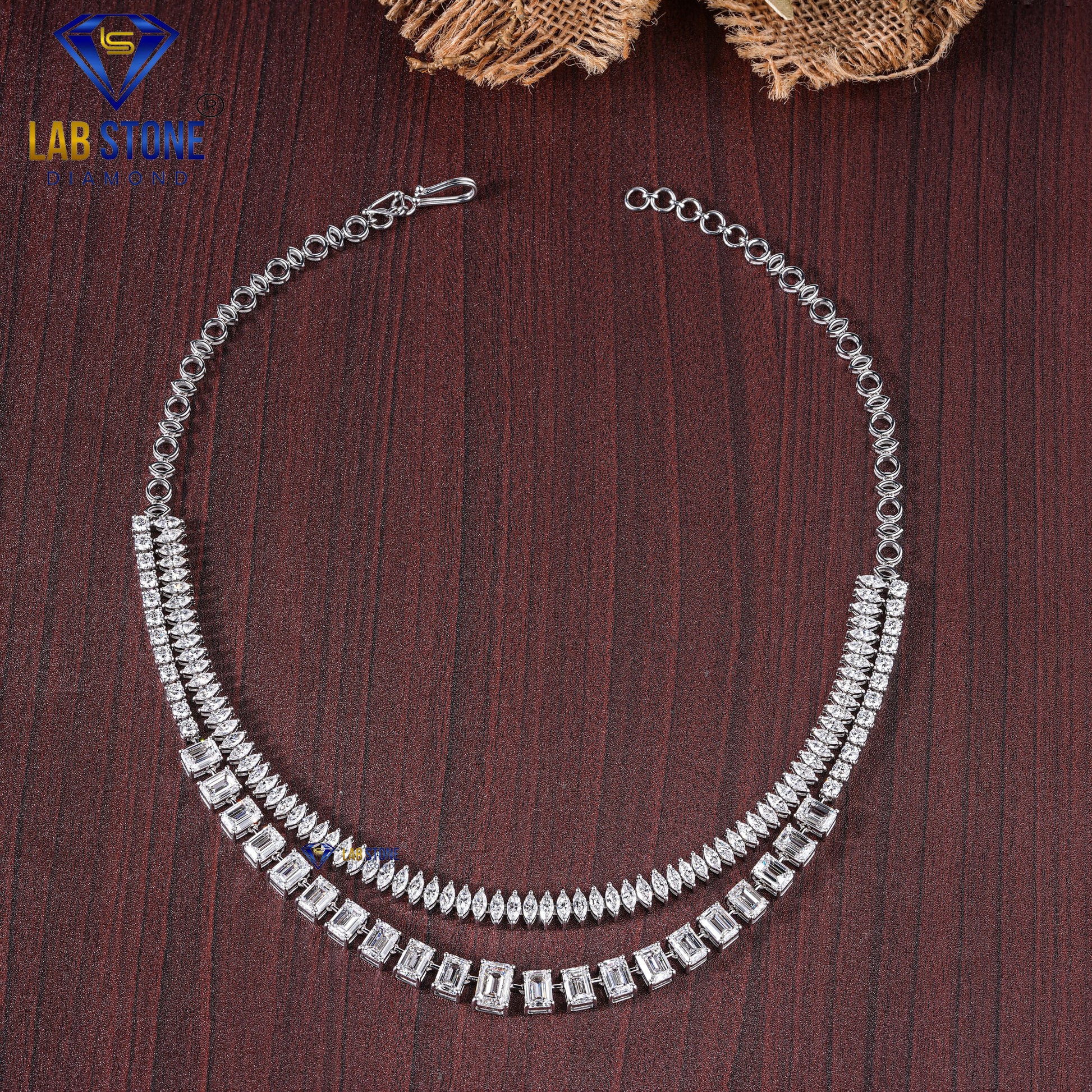 sophisticated blend of soft brilliance and sharp geometry. Classic round brilliants, elongated marquise diamonds and sleek emerald cuts are carefully matched and artfully arranged in a flowing charm-style design that drapes beautifully along the neckline. The mix of shapes creates extra dimension and fire, making this piece perfect for bridal styling, gala evenings or milestone celebrations. Expert craftsmanship and premium diamonds ensure this necklace is a timeless, heirloom-worthy treasure.