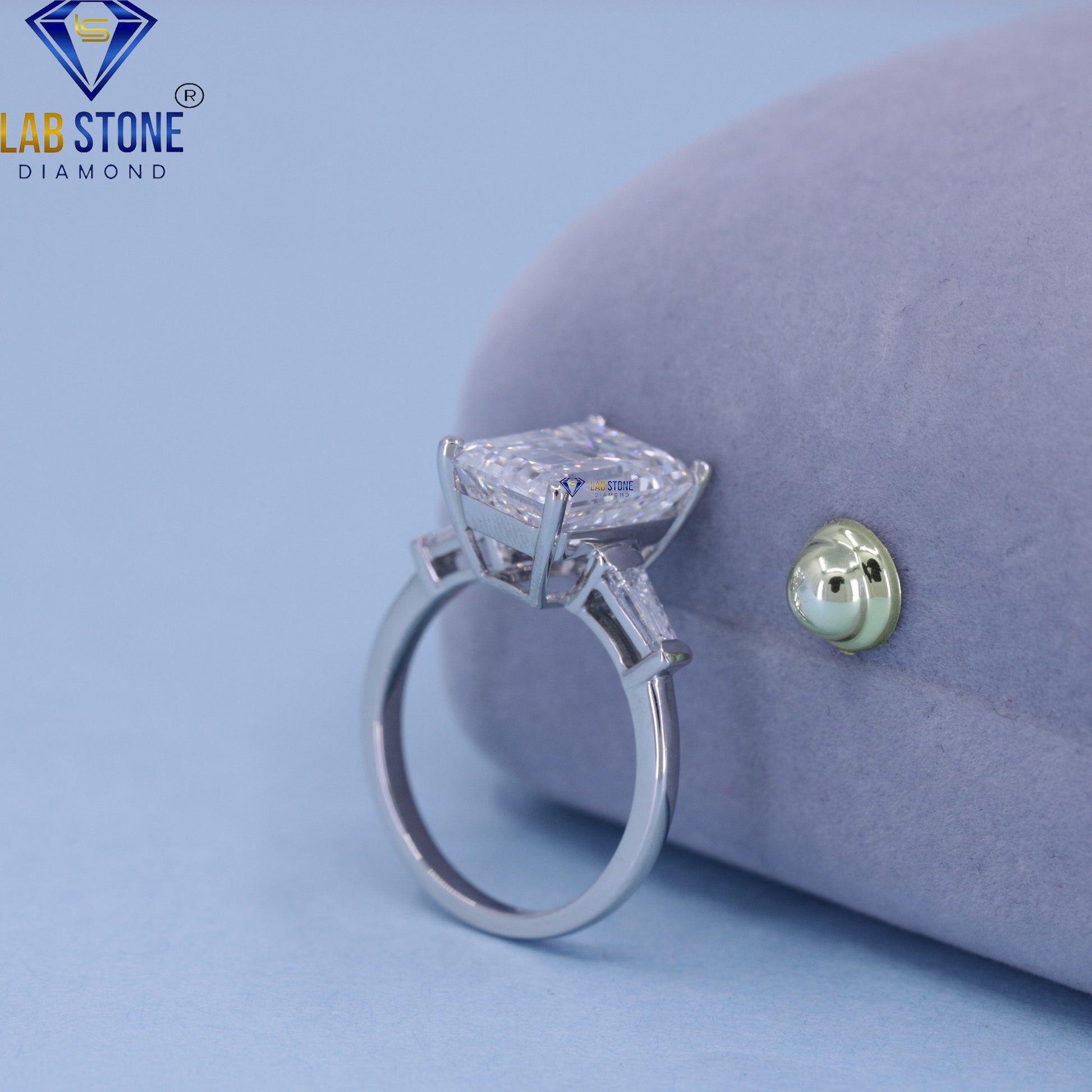 This 4.82 carat total weight three stone diamond ring features a stunning emerald cut center diamond flanked by elegant baguette cut diamonds. The emerald cut’s distinctive step-cut facets showcase timeless sophistication, while the baguette cut stones add refined geometric accents, enhancing the ring's overall brilliance.